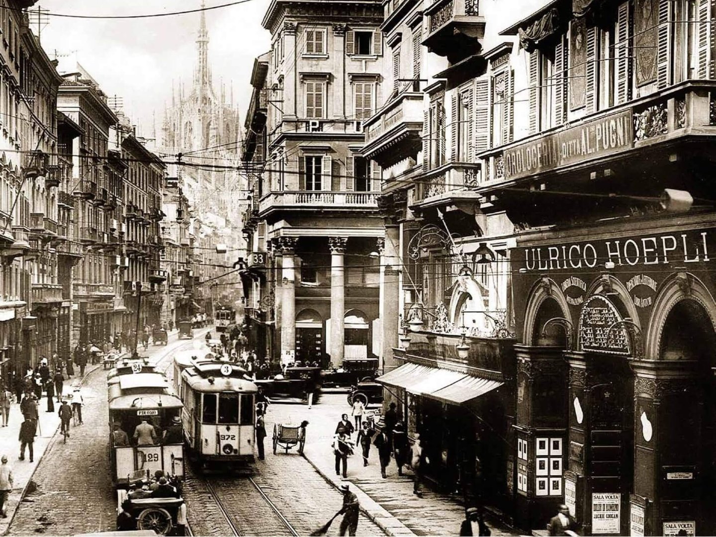Corso Vittorio Emanuele II, 1926 - Cars and trams still drive on the left side of the street. Right-hand traffic was introduced in Milan on August 1, 1926.